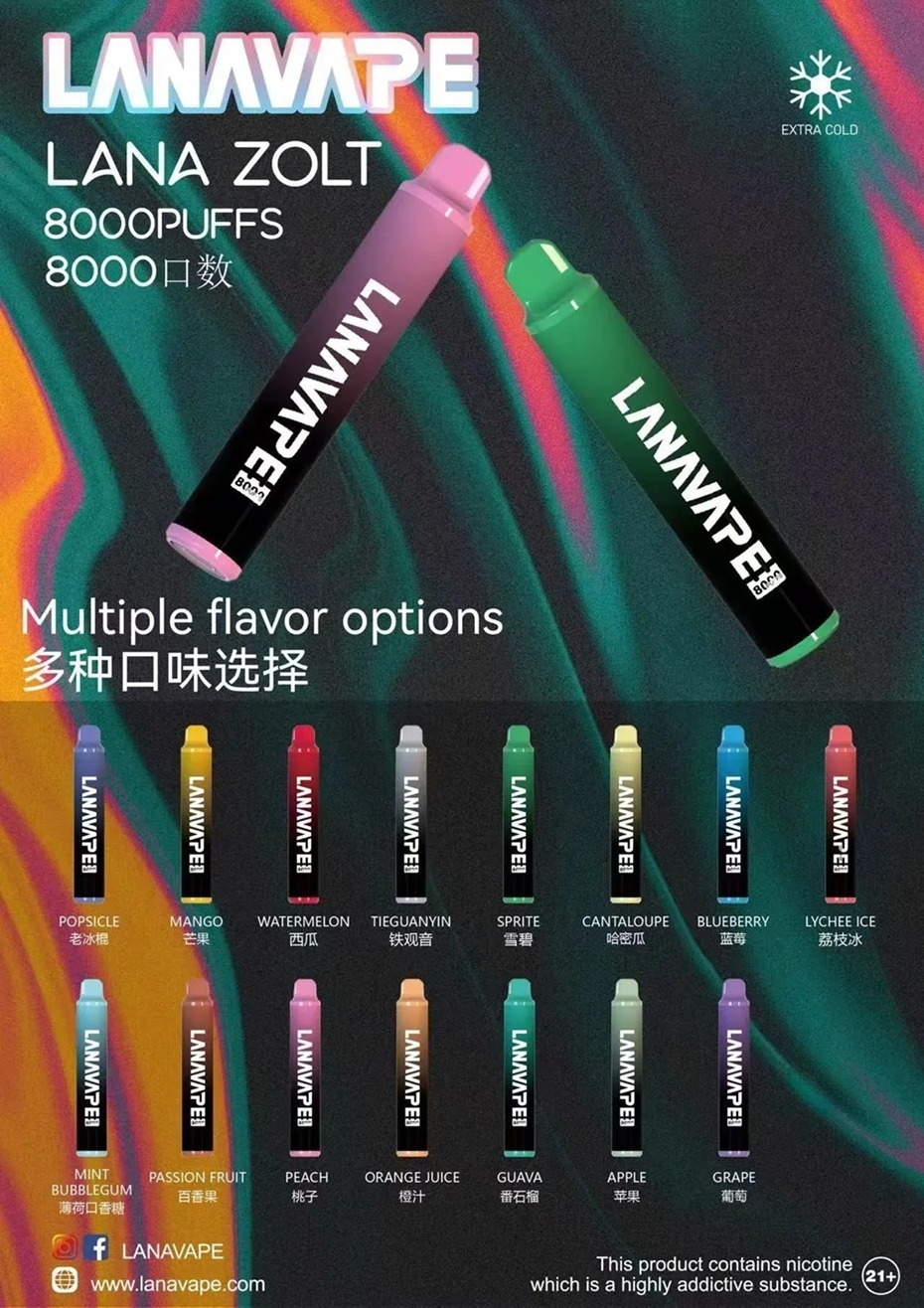 LANA品牌再度突破,重磅推出全新 8000口大容量一次性抛弃式电子烟,为电子烟爱好者带来无与伦比的便捷与享受!这款LANA 8000口电子烟完美结合了高容量设计与现代科技,850mAh大容量电池 搭配 10ml烟油,充分满足长时间的使用需求,让每一次吸雾都舒适流畅。