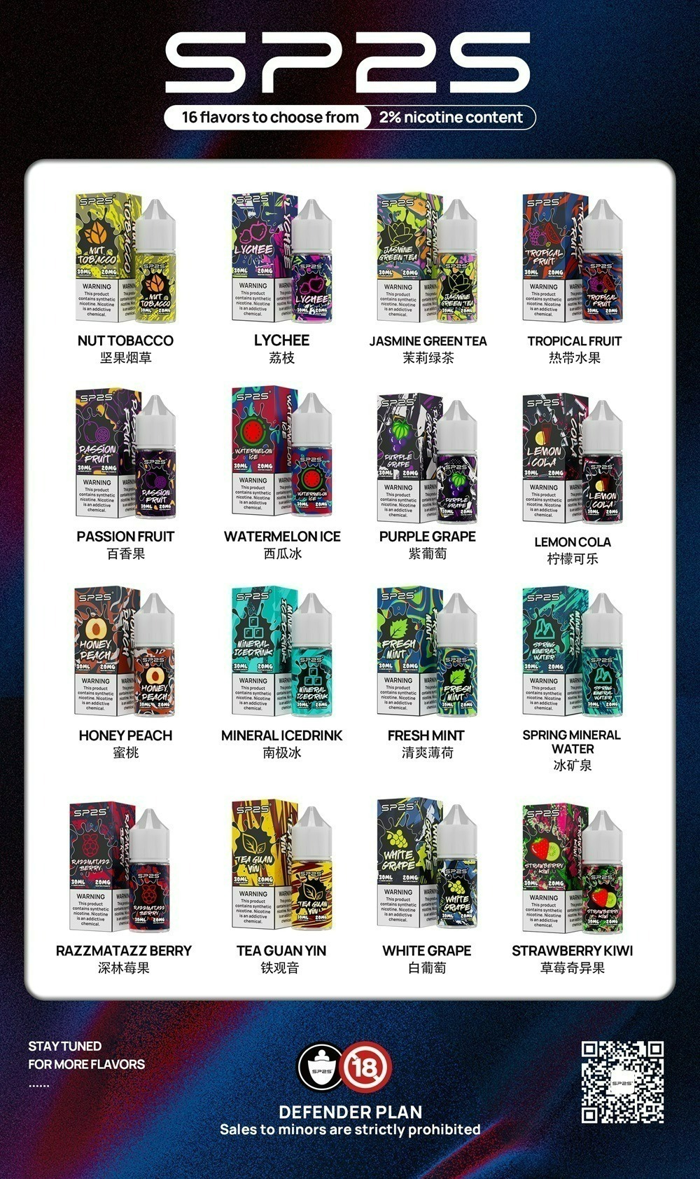 引領電子煙市場的新標準,SP2S思博瑞驕傲推出全新「SP2S煙油」,這款煙油系列擁有16種精緻口味,並採用2%尼古丁含量,以提升您的品吸體驗至全新高度。